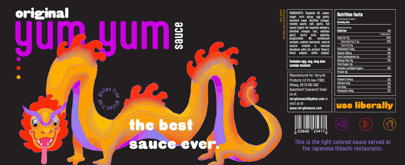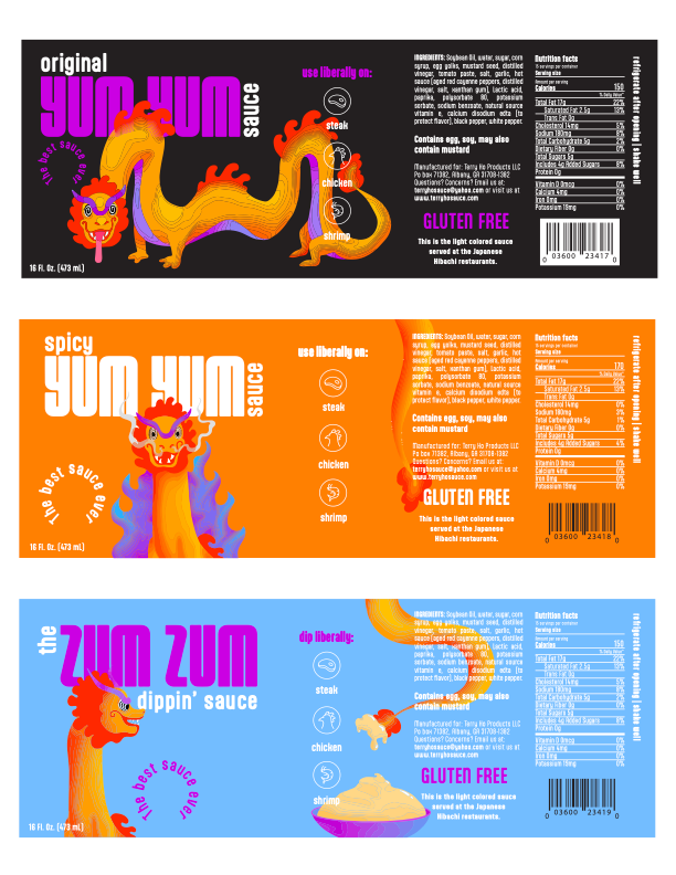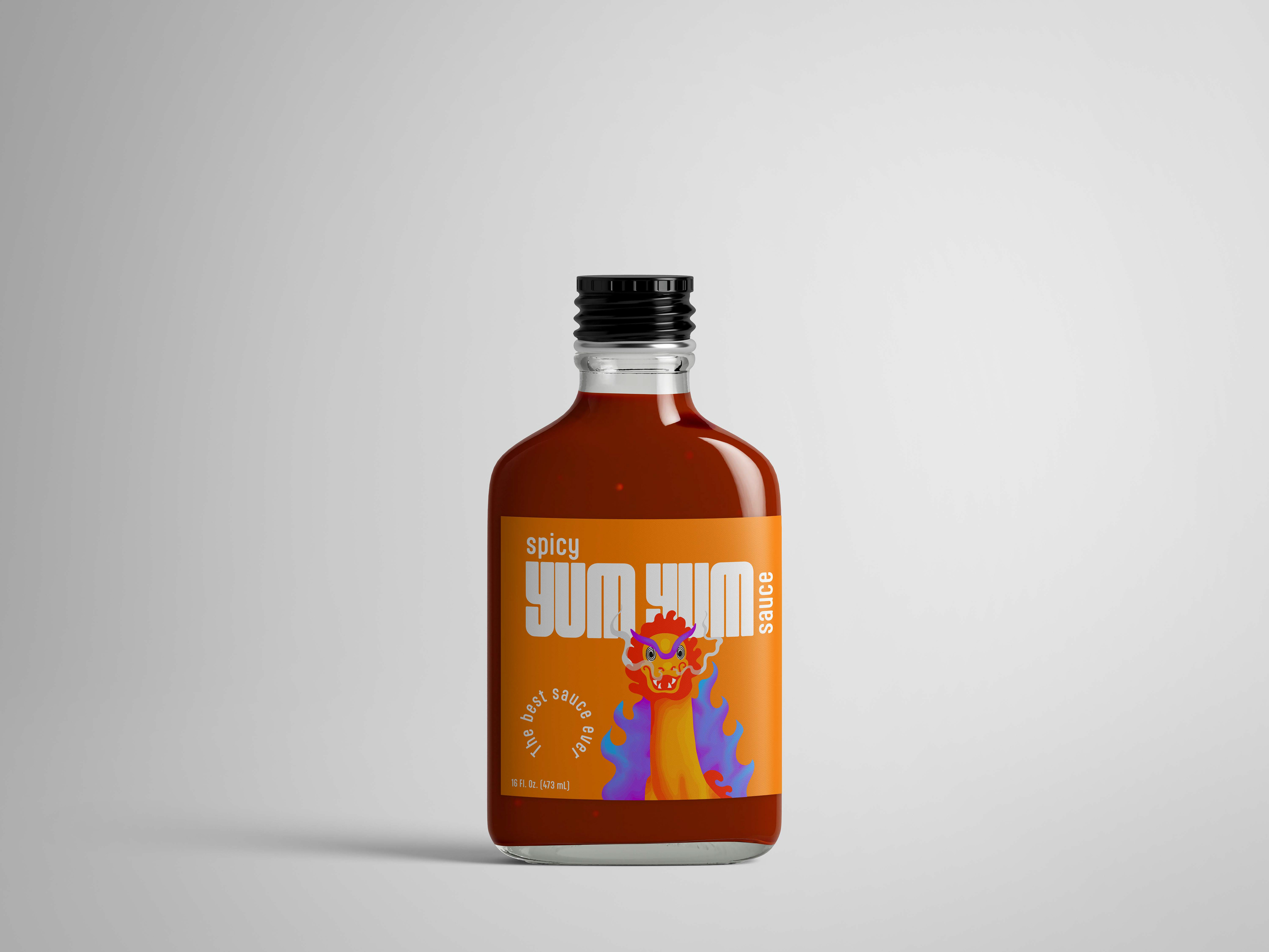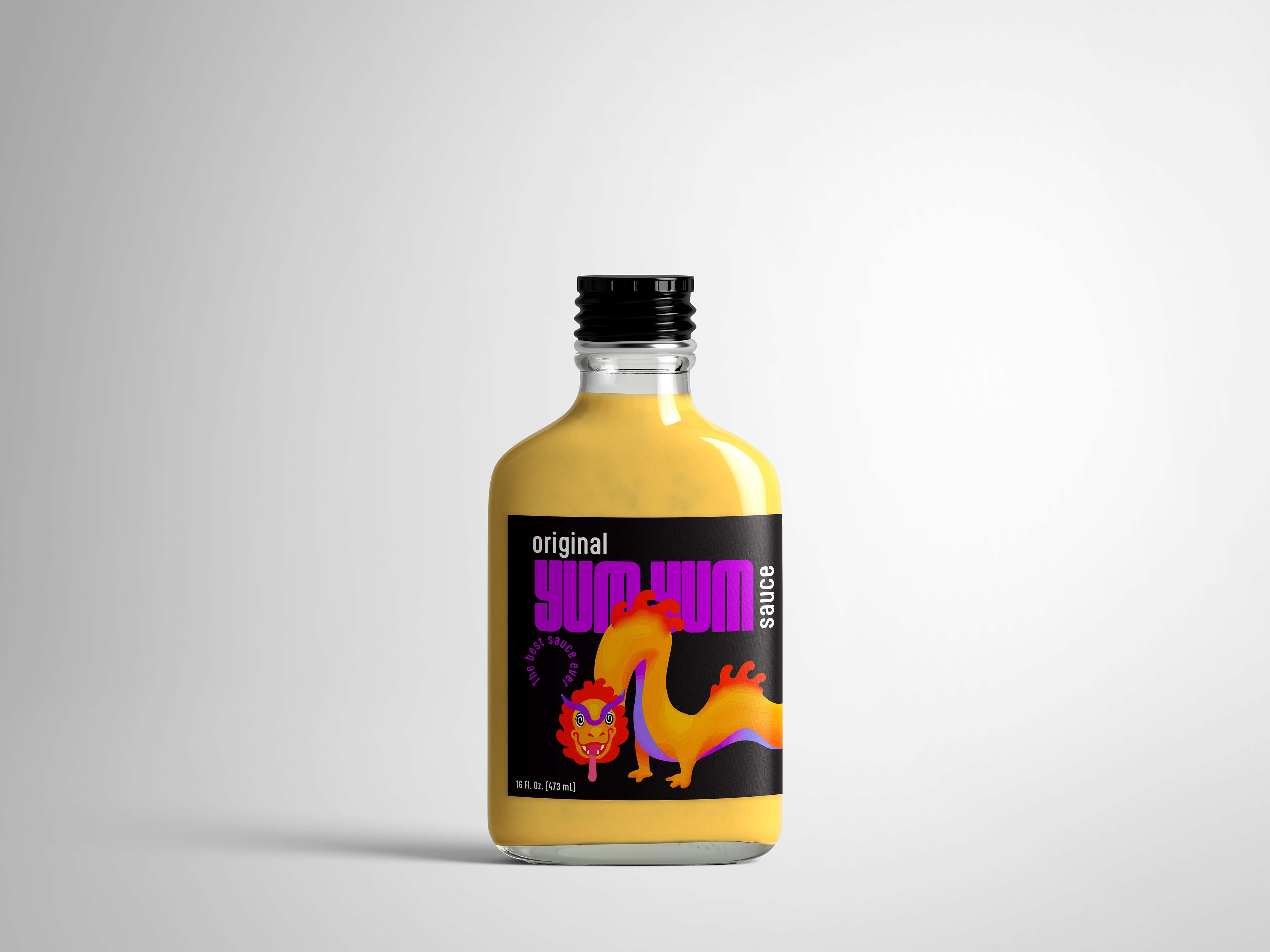 For the Yum Yum Sauce redesign, I developed a high-energy visual identity centered on bold typography and a vibrant color palette. Drawing inspiration from Japanese folklore, I conceptualized a custom dragon mascot to serve as the brand’s focal point. By designing the mascot to actively interact with the product—rather than just sit alongside it—I created a dynamic, engaging composition that demands consumer attention.